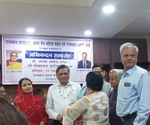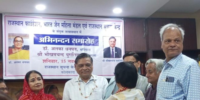 कोलकाता । मॉरिशस की हिन्दी साहित्यिक जगत की एक सशक्त हस्ताक्षर डॉ.अलका धनपत और सुप्रसिद्ध भामाशाह श्री भीखमचद पुगलिया का सम्मान राजस्थान सरकार के सूचना एवं जनसंपर्क विभाग राजस्थान सूचना केंद्र,भारत जैन महिला मंडल और राजस्थान फाउंडेशन के सयुंक्त तत्वावधान मे आयोजित किया गया। राजस्थान फाउंडेशन, भारत जैन इस कार्यक्रम में बतौर मुख्य अतिथि डॉ. अलका धनपत ,भीखमचद पुगलिया की उपस्थित रही तो समारोह की अध्यक्षता करी रतन शाह ( अध्यक्ष राजस्थानी प्रचारणी सभा) , विशिष्ट अतिथि के रूप में संतोष राजपुरोहित (चेयरमैन ,,राजस्थान फाउंडेशन कोलकाता चैप्टर) , अशोक कुमार वर्मा ( संयुक्त महाप्रबंधक, एयरपोर्ट ऑथोरिटी ऑफ इंडिया कोलकाता ) एवं डॉ.सुधा मल्होत्रा ( पूर्व प्रोफेसर , कुरूक्षेत्र यूनिवर्सिटी) मंचासीन रहें । आयोजन के दूसरे सत्र में भारत मूल की बेटी और मॉरिशस की धरती पर साहित्यिक परचम लहराने वाली शख्सियत डॉ.अलका धनपत के कर कमलों द्वारा इस वर्ष का अहिंसा पुरस्कार सुप्रसिद्ध समाजसेवी, भामाशाह सेठ भीखमचंद पुगलिया को प्रदान किया गया। यह पुरस्कार भारत जैन महिला मंडल द्वारा प्रदान किया गया, कार्यक्रम का सफल संचालन राजस्थान सूचना केंद्र कोलकाता के सहायक निदेशक हिंगलाज दान रतनू ने किया और सगं साथ रही भारत जैन महिला मंडल की सलाहकार अंजु सेठीया। कार्यक्रम के पश्चात चाय, नाश्ते का भी प्रबंध किया गया था।