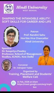 पश्चिम बंगाल, हिंदी विश्वविद्यालय द्वारा इस संगोष्ठी का आयोजन माननीय कुलपति प्रोफेसर नंदिनी साहू मैंम की अध्यक्षता में हुआ। जिसकी विशिष्ट वक्ता नई दिल्ली IGNOU की School of management की प्रोफेसर डॉ.अनुप्रिया पांडे जी थी, जिन्होंने अपने वक्तव्य में व्यवहार कौशल के महत्व को दर्शाते हुए यह बतलाया की कैसे औद्योगिक संस्थान गतिशील है, और वे न केवल तकनीकी कौशल चाहते हैं बल्कि सॉफ्ट स्किल और संचार कौशल पर भी जोर देते हैं।