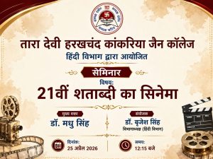 कोलकाता (25 अप्रैल, 2026) : तारा देवी हरखचंद कांकरिया जैन कॉलेज के हिंदी विभाग द्वारा “21वीं शताब्दी का सिनेमा” विषय पर एक सफल एवं ज्ञानवर्धक संगोष्ठी का आयोजन किया गया। कार्यक्रम का प्रारंभ औपचारिक स्वागत के साथ हुआ, जिसमें उपस्थित अतिथियों, शिक्षकगण एवं छात्र-छात्राओं का अभिनंदन किया गया। यह संगोष्ठी विद्यार्थियों के लिए समकालीन सिनेमा की समझ विकसित करने का एक महत्वपूर्ण अवसर सिद्ध हुआ।